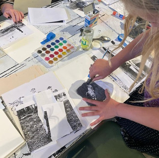 Saturday, July 9th, Pat Wheeler led a lively group of kids through a workshop where they turned personal photos into small works of art. photos were printed in black and white then the artists altered the prints with water color and drawing. The class was funded by the Maine Community Foundation in partnership with the Cynthia Winings Gallery in Blue HIll, as part of the Open Air Arts Initiative.